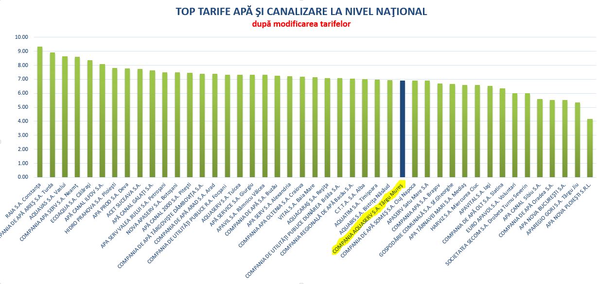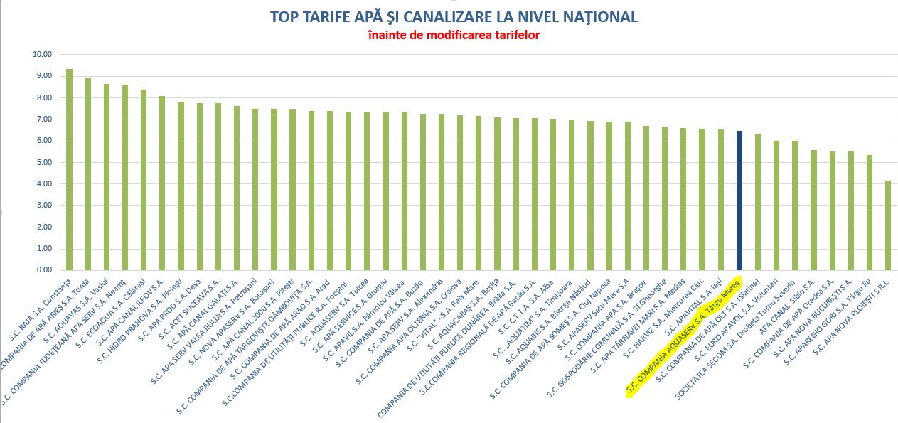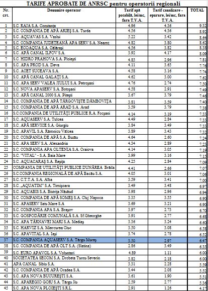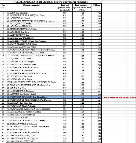 Tarifele de mai sus sunt stabilite în conformitate cu legislaţia specifică în vigoare din domeniu. Aceste preţuri au fost avizate de către A.N.R.S.C. – Autoritatea Naţională de Reglementare pentru Serviciile Comunitare de Utilităţi Publice prin adresa nr. 718477/16.01.2020, urmează a fi aprobate de Asociația de Dezvoltare Intercomunitară Aqua Invest Mureș și să intre în vigoare începând cu data de 18.03.2020.