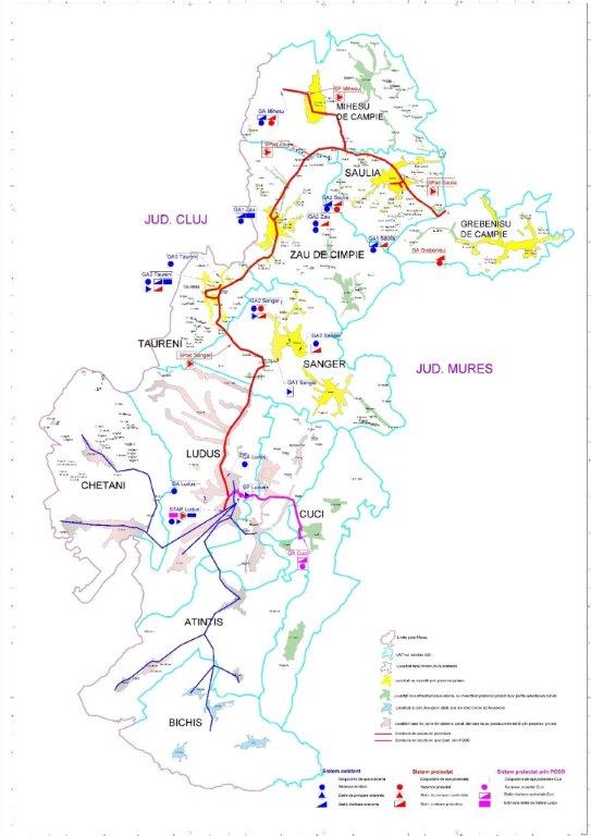 1. Construire conducte de legătură din magistrala principală la sistemele de distribuţie apă potabilă existente în comunele: Sânger, Tăureni, Zau de Câmpie, Miheșu de Câmpie, Șăulia, Grebenișu de Câmpie – valoare aprox. 6,3 milioane euro.
