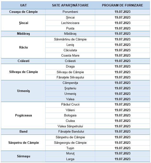 Compania AQUASERV S.A. anunţă consumatorii că, pe fondul temperaturilor ridicate, din cauza suprasolicitării sistemului de alimentare cu apă în principal ca urmare a utilizării apei potabile în alte scopuri decât cele casnice, începand cu data de 19.07.2022 pentru următoarele UAT-uri: Ceuașu de Câmpie, Șincai, Band, Râciu, Crăiești, Urmeniș, Silivașu de Câmpie, Mădăraș, Pogăceaua, Sâmpetru de Câmpie, Sărmaș, apa potabilă va fi furnizată la presiune normală conform următorului program: