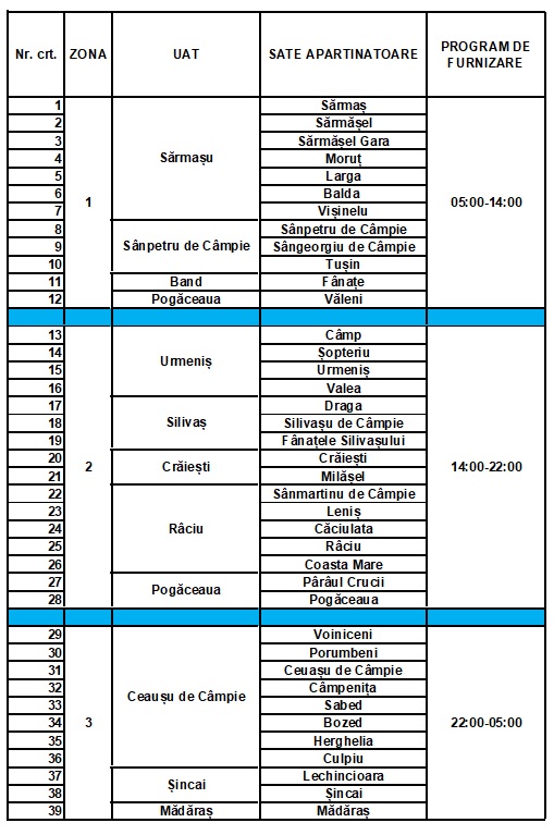 Având în vedere consumul excesiv al apei potabile pe fondul prelungirii perioadei cu temperaturi ridicate pe Zona de Câmpie, pentru următoarele UAT-uri: Ceaușu de Câmpie, Șincai, Band, Râciu, Crăiești, Urmeniș, Silivașu de Câmpie, Mădăraș, Pogăceaua, Sânpetru de Câmpie, Sărmaș, apa potabilă va fi furnizată după următorul program: