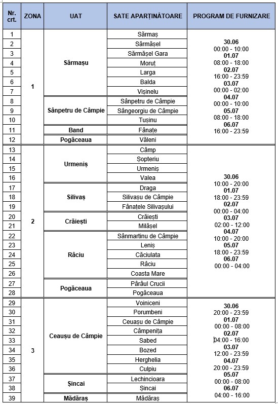 Având în vedere consumul excesiv al apei potabile pe fondul prelungirii perioadei cu temperaturi ridicate (seceta) de pe Zona de Câmpie și a numeroasele solicitări de reînpărțire a intervalelor orare de furnizare a apei potabile (astfel încât toți consumatorii să beneficieze de aproximativ aceleași intervale orare de timp) pentru următoarele UAT-uri: Ceaușu de Câmpie, Șincai, Band, Râciu, Crăiești, Urmeniș, Silivașu de Câmpie, Mădăraș, Pogăceaua, Sânpetru de Câmpie, Sărmaș, apa potabilă va fi furnizată după următorul program revizuit: