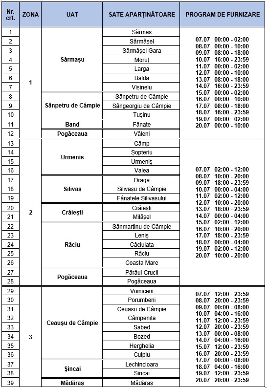 Având în vedere consumul excesiv al apei potabile pe fondul prelungirii perioadei cu temperaturi ridicate (seceta) de pe Zona de Câmpie și a numeroasele solicitări de reînpărțire a intervalelor orare de furnizare a apei potabile (astfel încât toți consumatorii să beneficieze de aproximativ aceleași intervale orare de timp) pentru următoarele UAT-uri: Ceaușu de Câmpie, Șincai, Band, Râciu, Crăiești, Urmeniș, Silivașu de Câmpie, Mădăraș, Pogăceaua, Sânpetru de Câmpie, Sărmaș, apa potabilă va fi furnizată după următorul program revizuit: