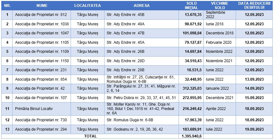 Compania AQUASERV S.A. Târgu Mureş este nevoită ca, în perioada 12-19 septembrie 2023, să reducă debitul apei potabile furnizate la minimul prevăzut în actele de reglementare, către 13 asociaţii de proprietari/locatari, cu restanţe către companie. Asociaţiile de proprietari vizate au datorii cumulate de peste 1.395.000 de lei, cu o vechime de cel puţin 90 de zile.
