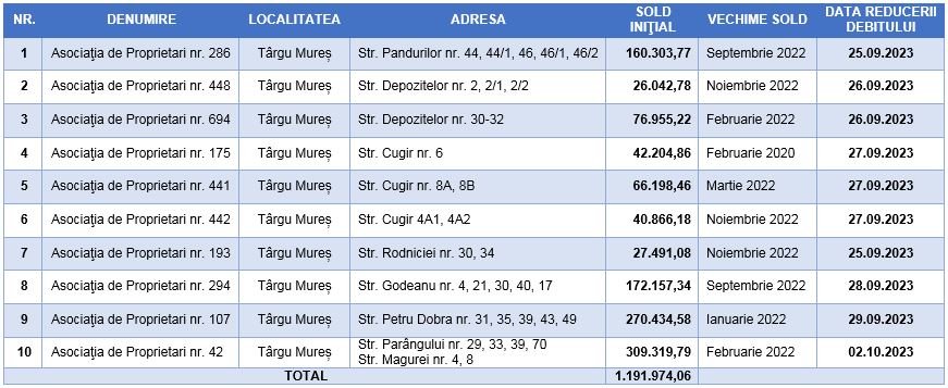 Compania AQUASERV S.A. Târgu Mureş este nevoită ca, în perioada 25.09-02.10.2023, să reducă debitul apei potabile furnizate la minimul prevăzut în actele de reglementare, către 10 asociaţii de proprietari/locatari, cu restanţe către companie. Asociaţiile de proprietari vizate au datorii cumulate de peste 1.190.000 de lei, cu o vechime de cel puţin 90 de zile.